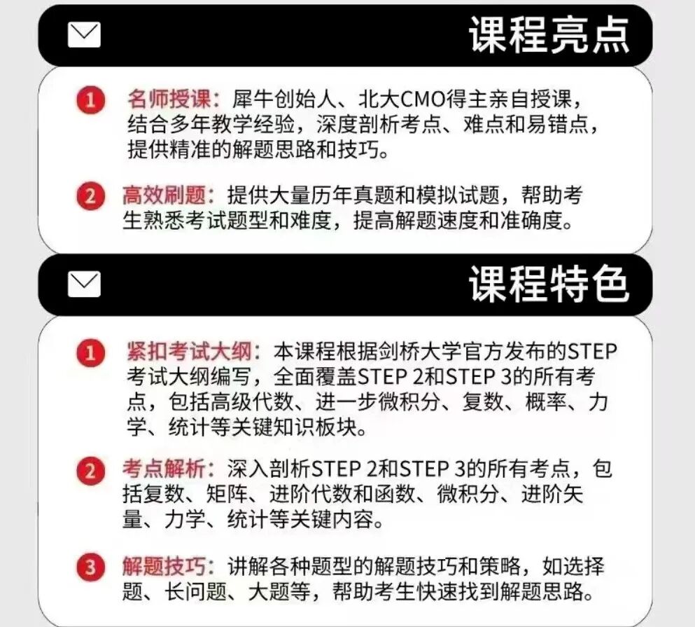 犀牛课程提供近20年的STEP真题训练,并配备专业教师详细讲解。尤其注重训练学生应对STEP考试的独特题型和解题思路,培养数学思维和逻辑推理能力。