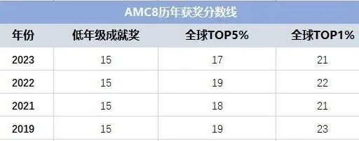 (tip:AMC8竞赛总共有25道选择题,每题1分,满分25分。满分奖需要答对全部25题。根据历年情况,全国范围内AMC8的平均分在14分左右,而高分段的学生人数相对较少,显示出竞赛的难度和竞争性。)