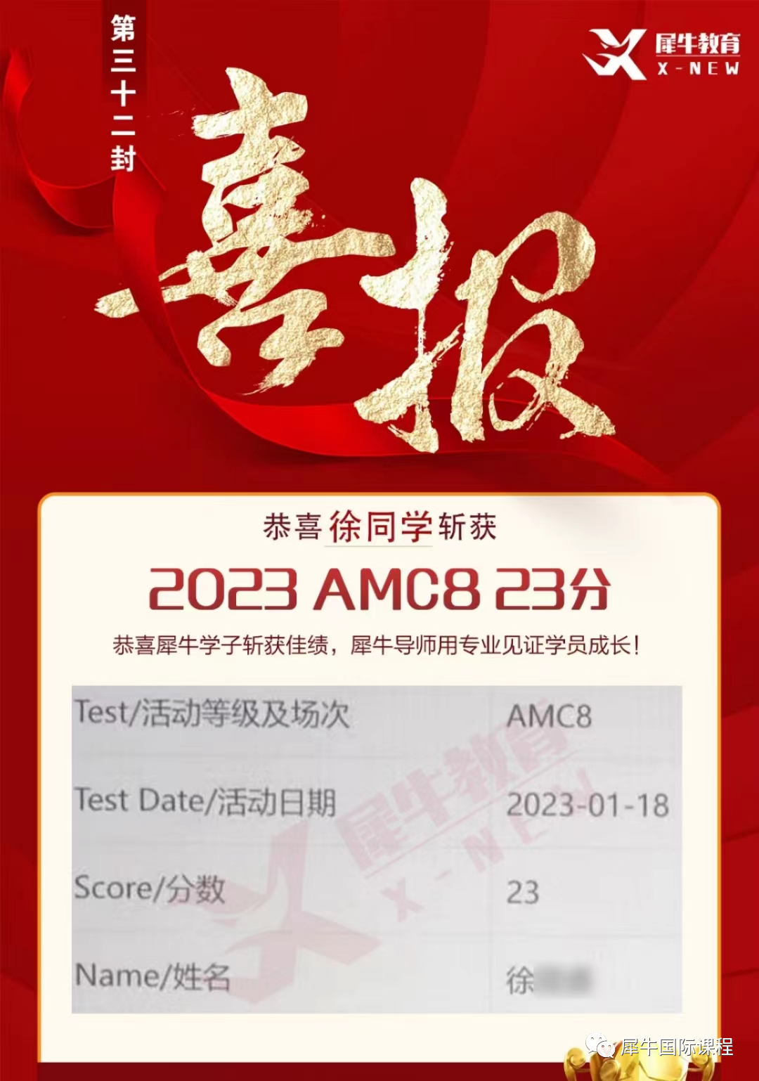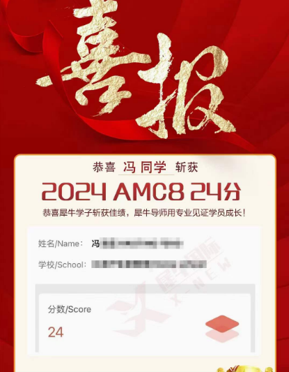 犀牛教育AMC的学员的晋级率高,并且AIME的学员大部分都可以达到10分以上的成绩,犀牛教育的教学实力是被证明的。2024年犀牛AMC8学子取得了满分25分优异成绩,24分频现!!!