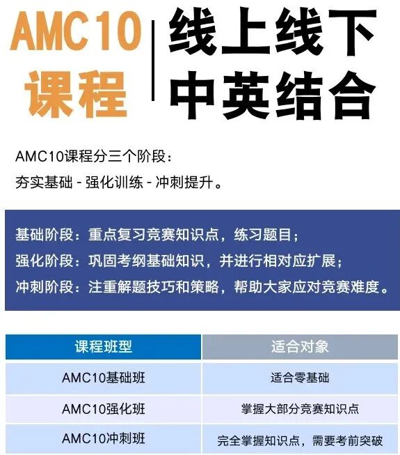 如果你想要系统的备考AMC10数学竞赛,从知识点开始学起,逐步巩固练习,到最后模考冲刺,那我推荐110小时AMC10直通车课程,包含三大课程阶段:基础+冲刺+模考。
