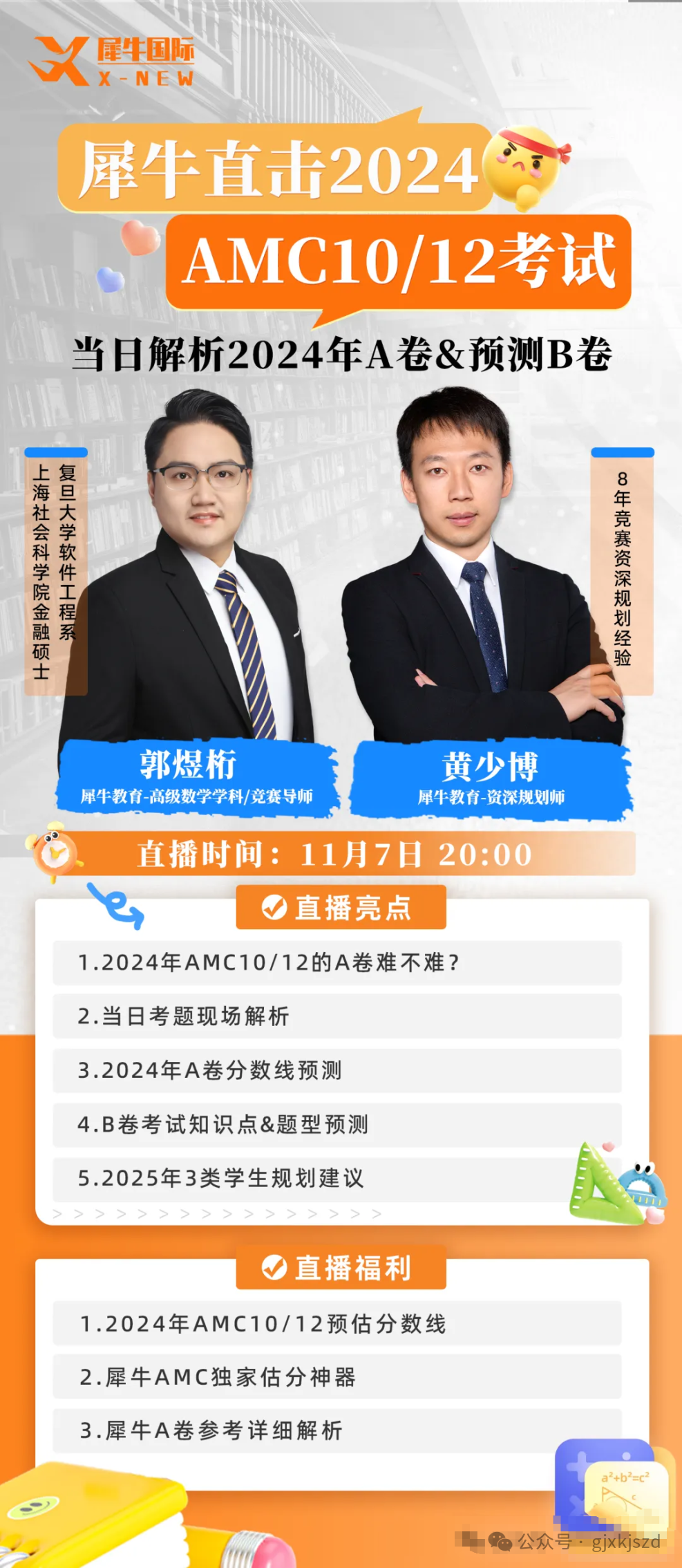 2024年AMC10/12竞赛于今天正式开考。为了帮助大家更好地了解自己的表现,我们提供AMC10/12真题解析预约服务,欢迎大家前来对答案。