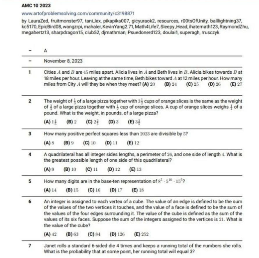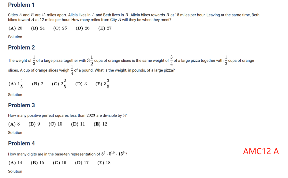 •AMC12 B卷:难度与A卷接近,但罕见地出现了判断题,这类题目比较耗费时间。此外,这份试卷的题目难度变化也较大,并不完全随着题号的增长而增加难度。