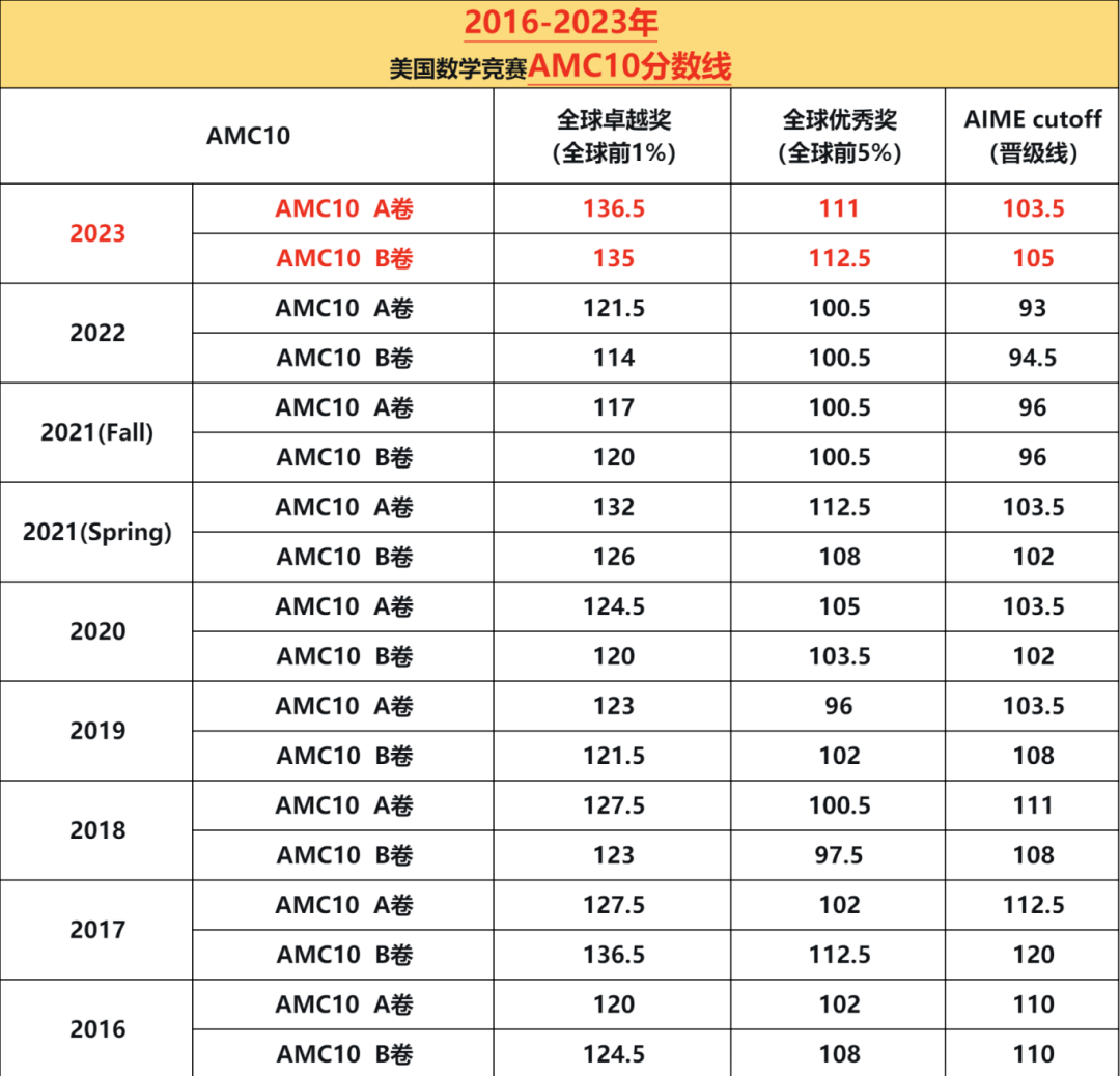 去年(2023年)AMC10的分数线虚高,直冲历史最高点,想要冲刺AMC10数学竞赛全球前5%需要考到111分,而想要冲刺全球前1%,则要拿到135分以上,今年不出意外的话分数线会有所回落。