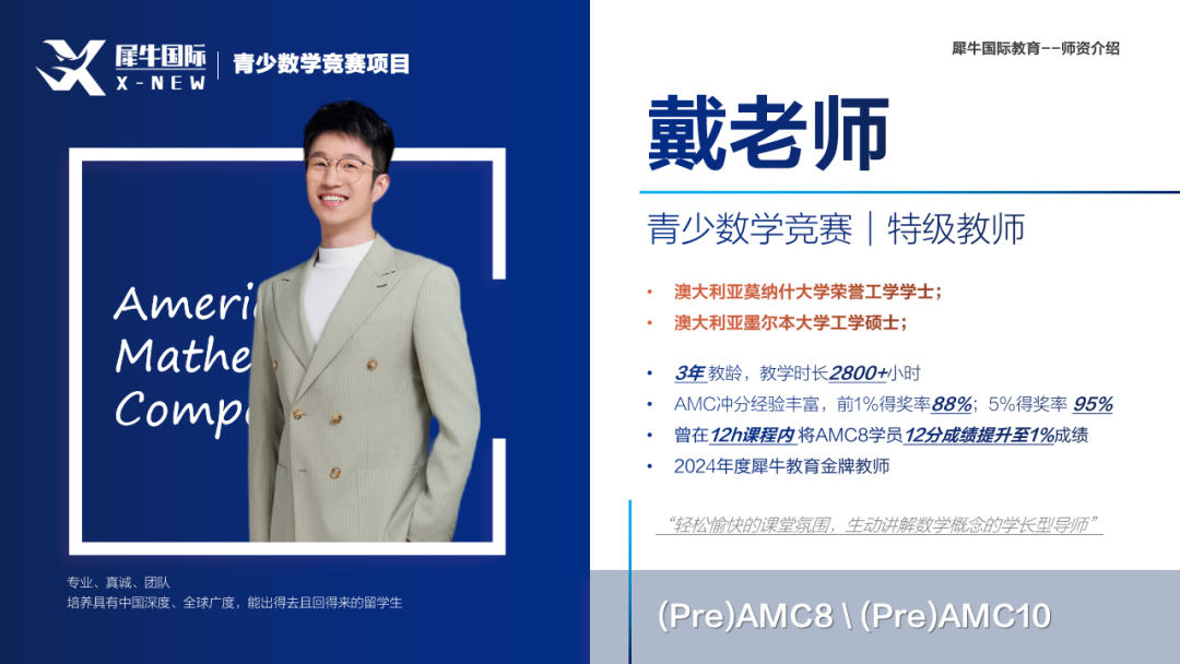 犀牛教育的师资团队由国内外名校毕业的教师组成,经过严格的选拔和培训,具有丰富的教学经验和竞赛指导能力。他们熟悉AMC8竞赛的命题规律和特点,能为孩子们够提供专业且高效的教学。