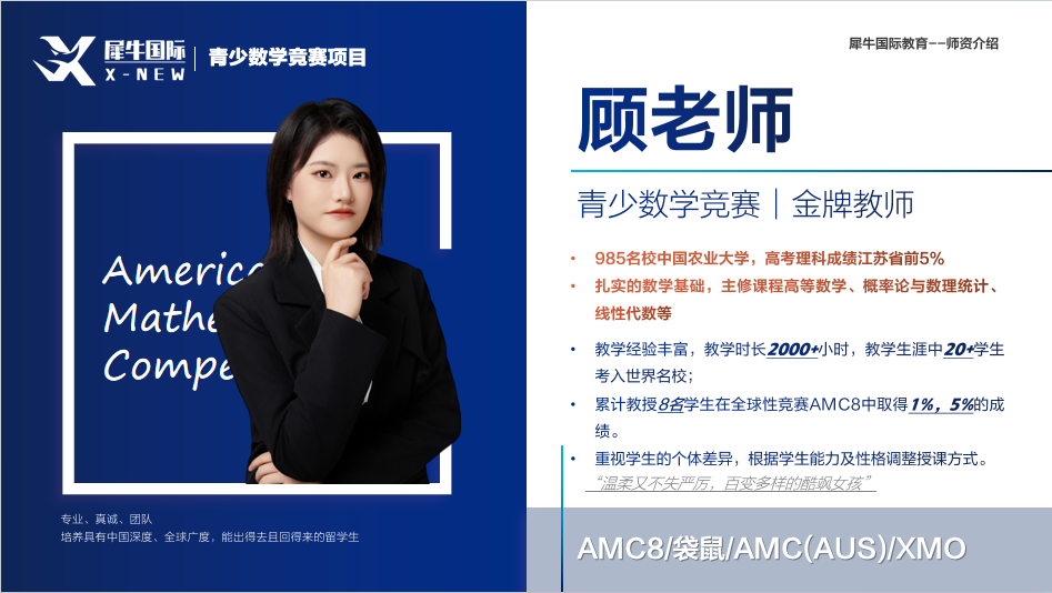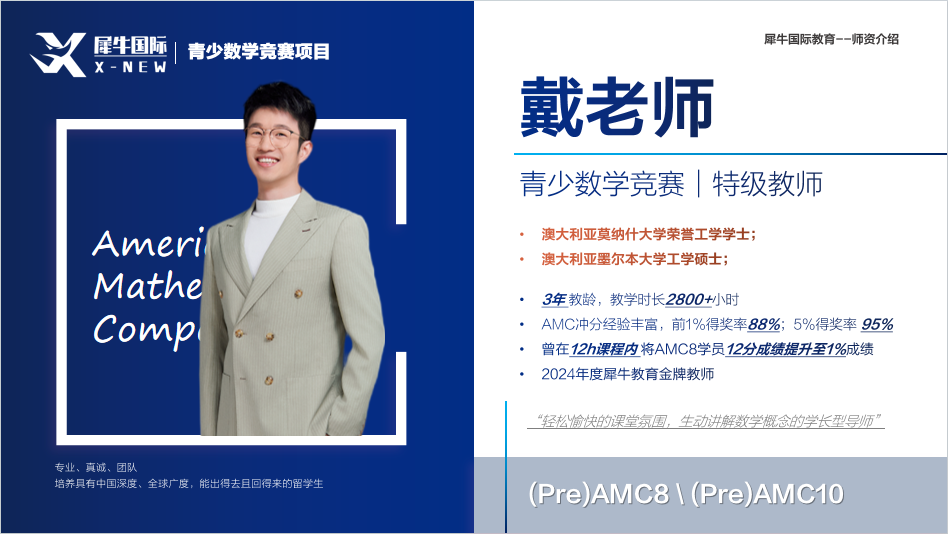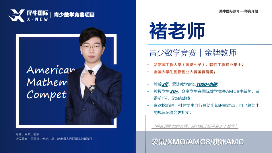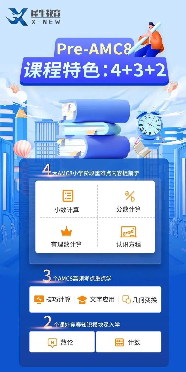相较于国外的小孩,国内的孩子在数学学习上会展示出天然的优势,这也是AMC8数学竞赛虽然是针对8年级及以下学生的一项国际数学竞赛,在中国的参赛群体却以3-5年级小学生为主的原因,对于年龄比较小或者数学基础比较薄弱的学生来说,直接学习AMC8会比较吃力,针对这种情况,犀牛特推出Pre-AMC8课程!更适合中国孩子的AMC8备考课程!一起来了解一下吧~
