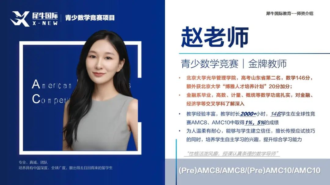 犀牛AMC8师资均来自国内外一流名校:北京大学、伊利诺伊香槟分校、波士顿大学、复旦大学等等,竞赛培训经验丰富。帮助数位同学在AMC8竞赛中取得前1%,详细简历介绍如下: