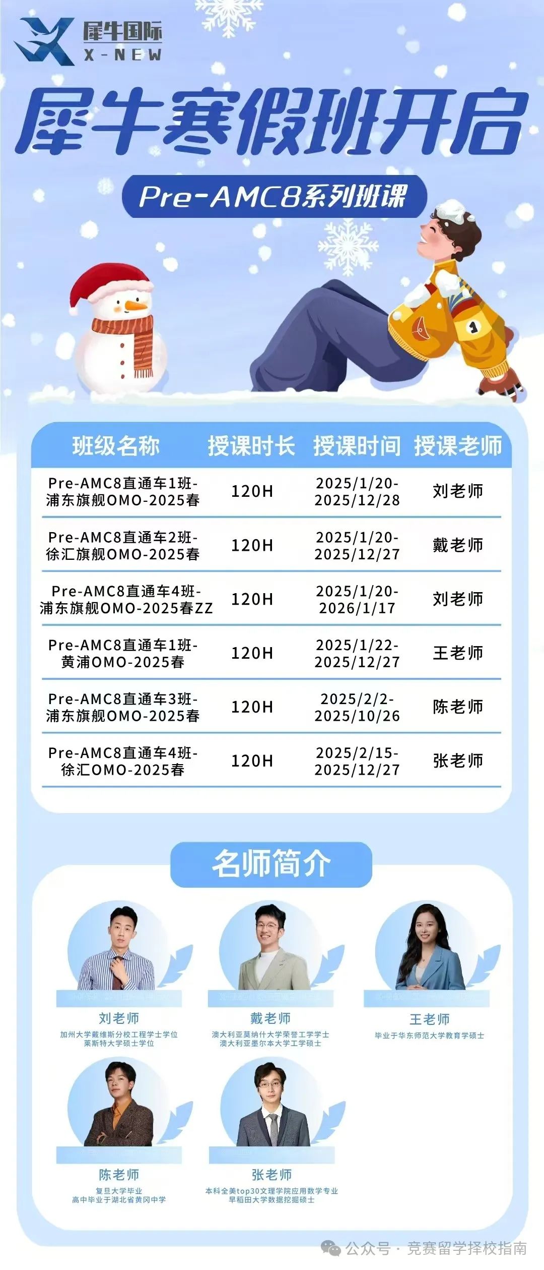 犀牛针对三公开设AMC8培训班,分为Pre-AMC8课程、基础班、强化班、冲刺班等不同阶段班级,入班前先进行测试,再根据测试结果安排合适的班级,从根本杜绝学不懂,听不懂的情况出现,一站式冲刺AMC8高分成绩。