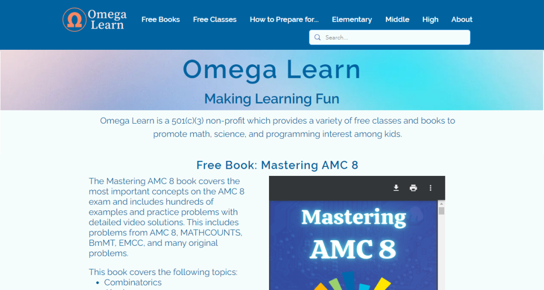 https://www.omegalearn.org/(https://www.omegalearn.org/) ,该网站涵盖了小学、初中、高中各个学习阶段的资源,特别为AMC竞赛提供了备考资源,可以找到AMC10的免费课程、推荐书单、数学公式、竞赛准备建议等。