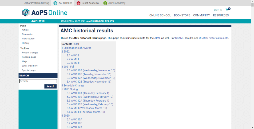 https://artofproblemsolving.com/wiki/index.php/AMC_Problems_and_Solutions(https://artofproblemsolving.com/wiki/index.php/AMC_Problems_and_Solutions) ,这个网站提供了AMC竞赛的历年真题和解析,以及数学竞赛的推荐书籍、数学网站、数学论坛等资源,对于正在备考的同学来讲非常实用。