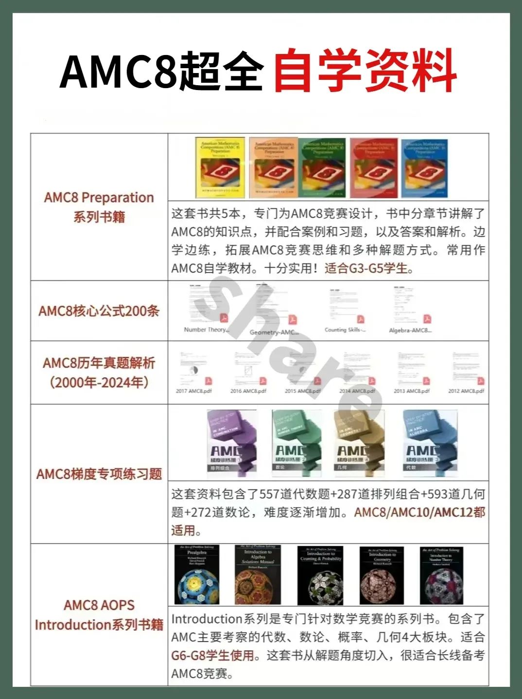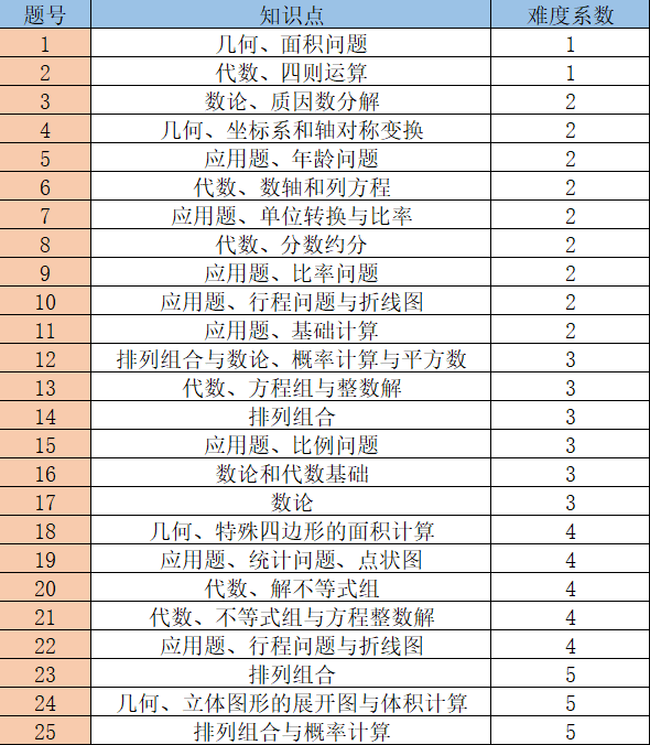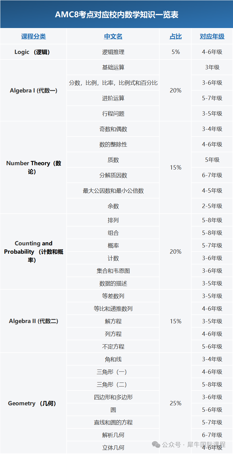 AMC8竞赛主要对标美国7、8 年级学生的数学水平,考察的知识点也都限定在8年级以下,涵盖小学数学知识、部分初中数学知识以及一些小学奥数知识点。在国内,其难度大致相当于小学6年级杯赛的水平。