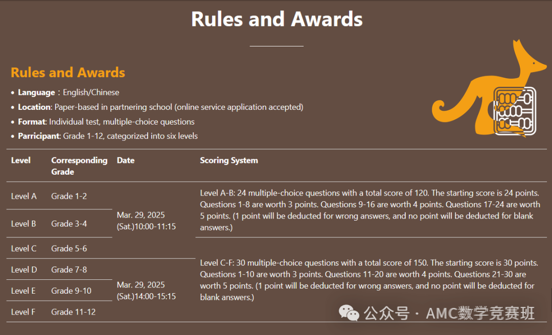 考试规则:中英双语,个人比赛,共30道题,25道选择题,5道填空题,总分135分 参赛年级:3-12年级 难度等级: 等级A:G3-G4; 等级B:G5-G6; 等级C:G7-G8 等级D:G9-G10; 等级E:G11-G12