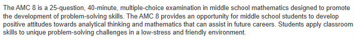 在 AMC 系列赛事中,AMC8数学竞赛主要面向八年级及以下的学生群体。它本质上是一场数学测验,核心目的在于提升学生解答数学习题的能力。