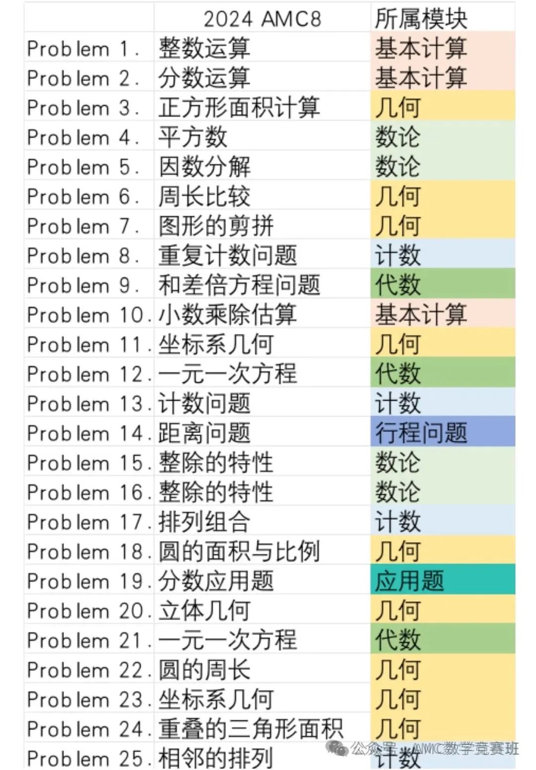 AMC8数学竞赛考查内容与7、8年级数学教学大纲相匹配,涵盖但不限于整数、分数、小数、百分数、比例、数论、基础几何知识、面积与体积计算、概率和统计以及逻辑推理等多个方面。