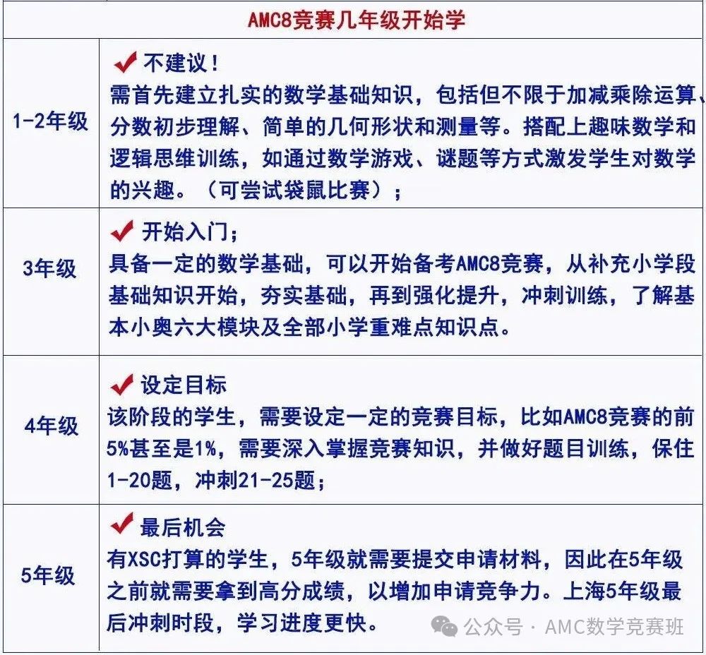 从3-4年级开始准备AMC8竞赛较为适宜。处于这个年龄段的孩子,已经掌握基础数学知识,初步发展出逻辑思维能力。尽管AMC8难度较大,但含金量极高。能力出众的孩子值得尝试,这无疑是证明自己在同龄人中出类拔萃的有力方式。