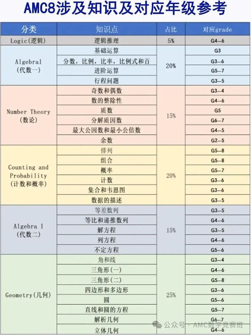 AMC8竞赛考试涵盖基础几何、代数、数论、组合这四大模块。其考察内容涉及整数、分数、几何、数论、概率、逻辑推理等,囊括小学数学、小学奥数以及部分初中数学知识。题目难度循序渐进,既夯实学生数学基础,又检验解题策略与应对难题的能力。