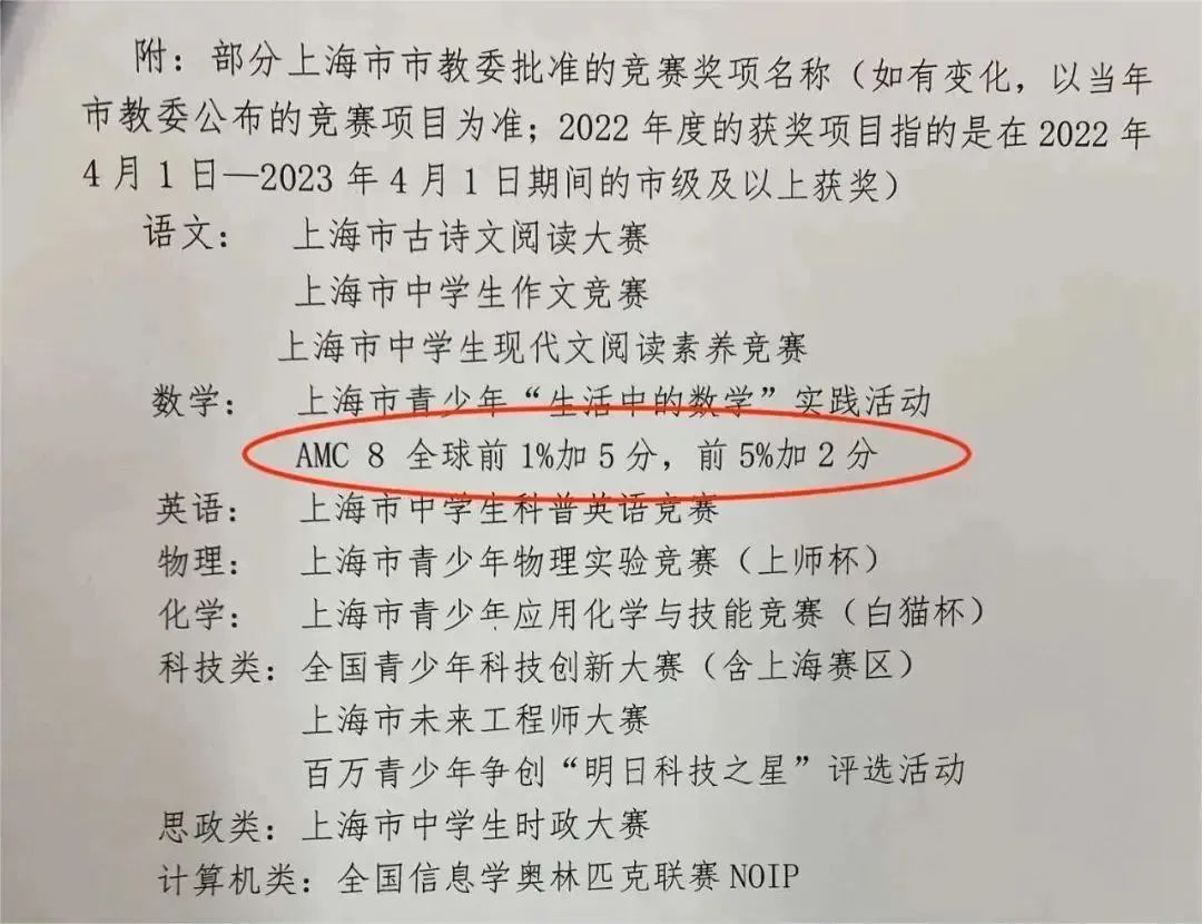 以上海的小升初为例,依据上海市教委的官方文件,AMC8竞赛的成绩在小升初的入学考试中具有明显的加分效果:全球排名前1%的学生可以获得5分加分,而排名前5%的学生则可以获得2分加分。