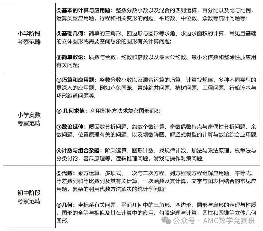 AMC8数学竞赛的内容涵盖了小学和初中阶段的知识,包括小学阶段的数学以及初中的校内内容,此外还有小学奥数的相关内容。因此,不建议小学低年级的孩子参加此类学习,这可能会成为他们的一种负担。