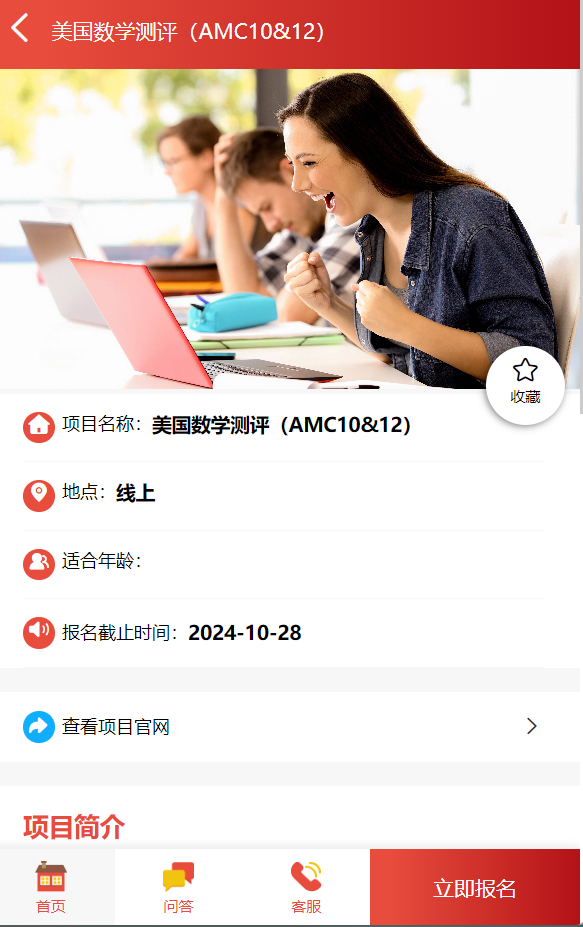 第三步:找到“美国数学测评(AMC10&12)”进入,点击立即报名