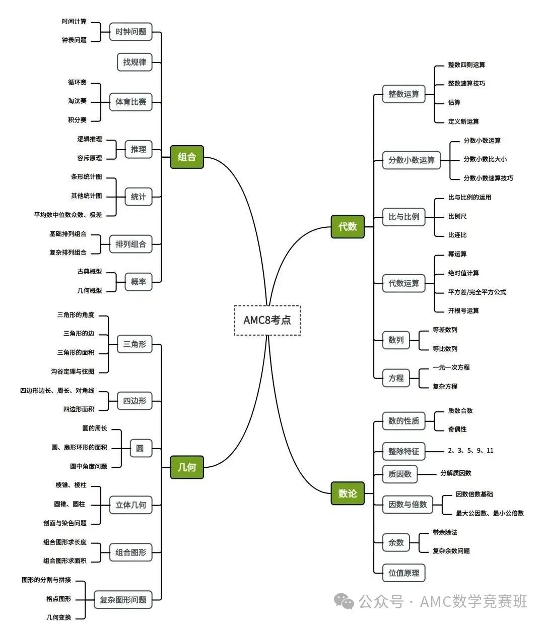 AMC8的难度并不直接对应国内单一考试,整体呈现“小学奥数为主、衔接初中基础”的特点,内容覆盖代数、几何、数论、组合四大模块。