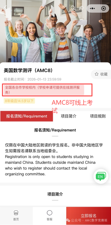 入学要求:AMC8现有15分以上或模拟测试18分以上
