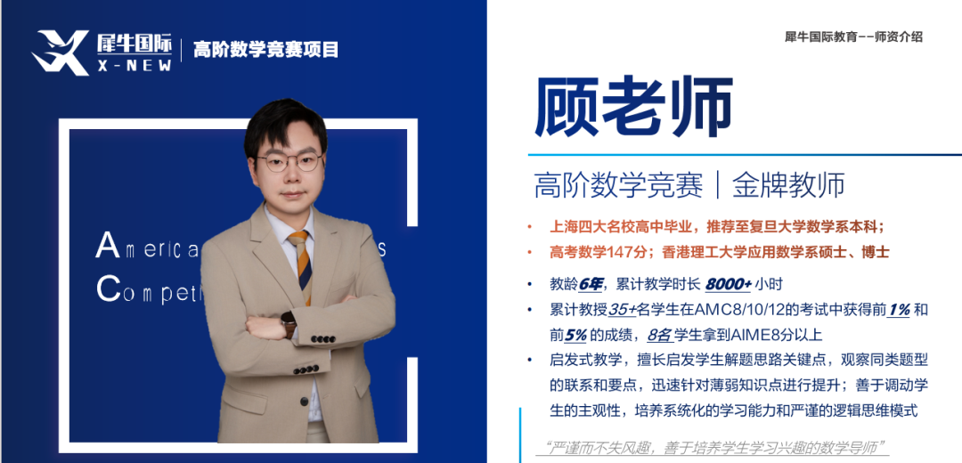 犀牛针对AMC10/12数学竞赛晋级AIME的学生,分别开设了不同班型,AIME培训课程师资都是来自国内外名校的牛师,培训经验极其丰富,帮助过众多同学们在AIME的考试中取得过高分成绩。