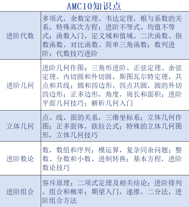 比赛难度:AMC10考察的内容涵盖G9-10(初三和高一)的数学课程内容,包括初等代数、基础几何学(勾股定理、面积体积公式等)、初等数论和概率问题。