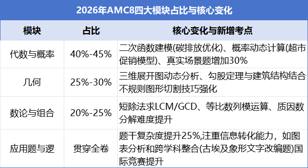 2026年AMC8数学竞赛考试依旧是25道选择题,但题型设计上更强调跨学科应用与高阶逻辑推理,具体调整内容如下: