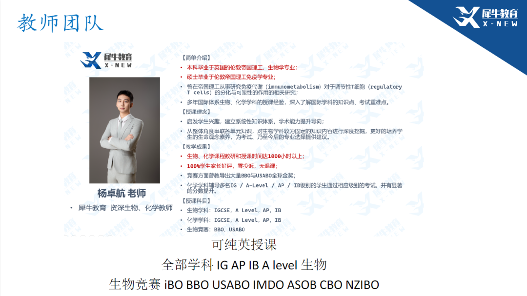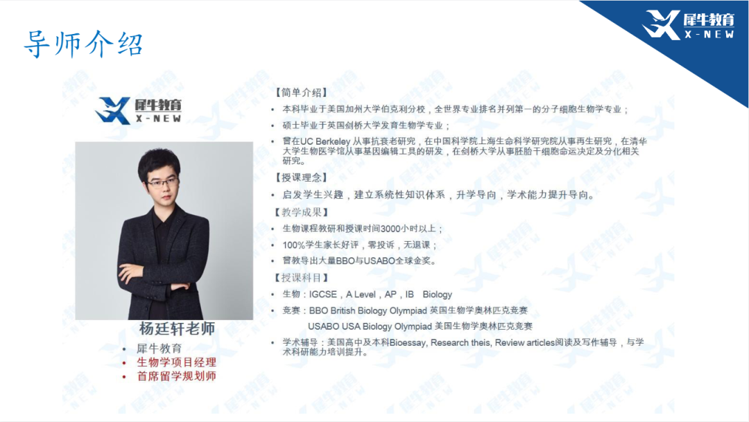 USABO/BBO培训课程也是犀牛主打的生物竞赛培训,为满足广大同学同时备考USAB和BBO两项生物竞赛的需求,特开设有USABO&BBO直通车班/USABO&BBO强化班/BBO基础班等多种培训课程班型,一个课程冲刺拿下USABO&BBO双金!