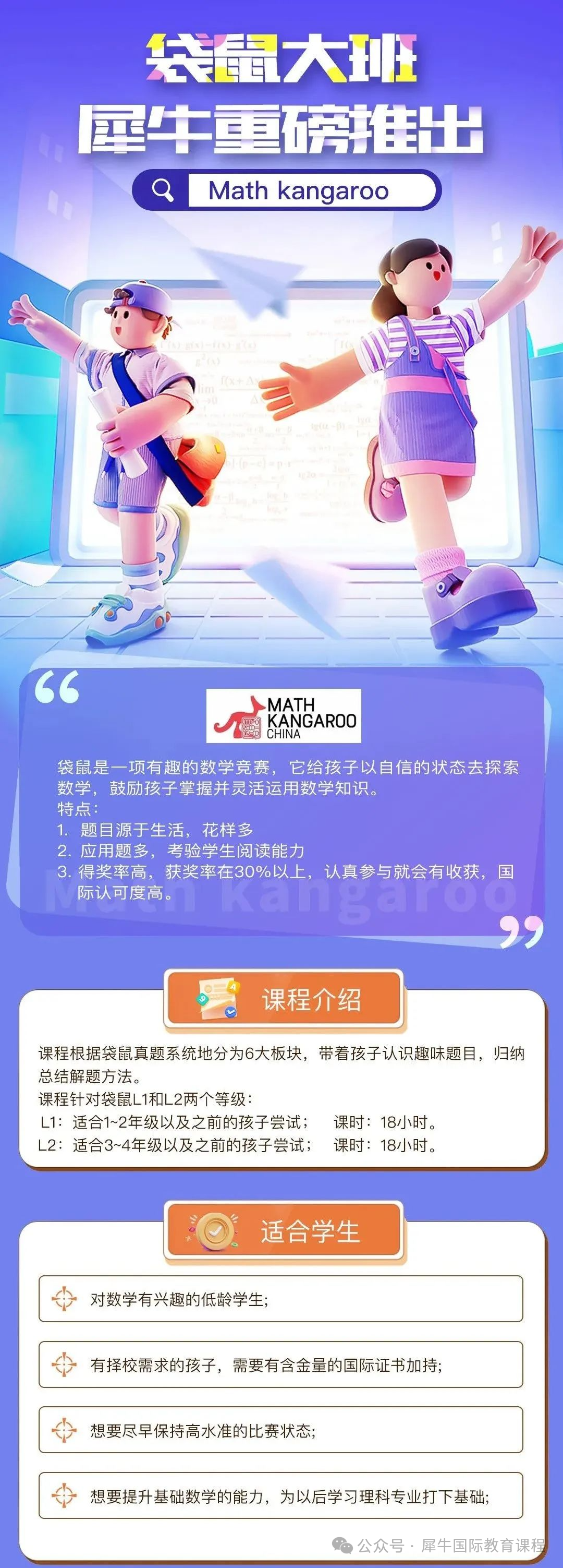 袋鼠数学竞赛是小学生数学启蒙的最佳选择,开学季已经来临,如果你还在担心孩子校内数学跟不上,那就来看看犀牛教育袋鼠数学竞赛课程。袋鼠数学竞赛辅导一节课多长时间?在哪里可以学袋鼠竞赛课程?犀牛教育在上海有袋鼠竞赛线下课吗?更多课程详情,可添加微信小助手