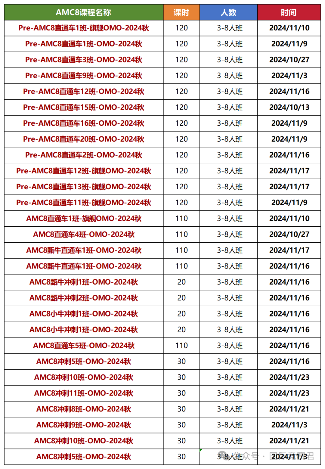 课程类型:Per-AMC8课程/AMC8基础班/AMC8强化班/AMC8冲刺班