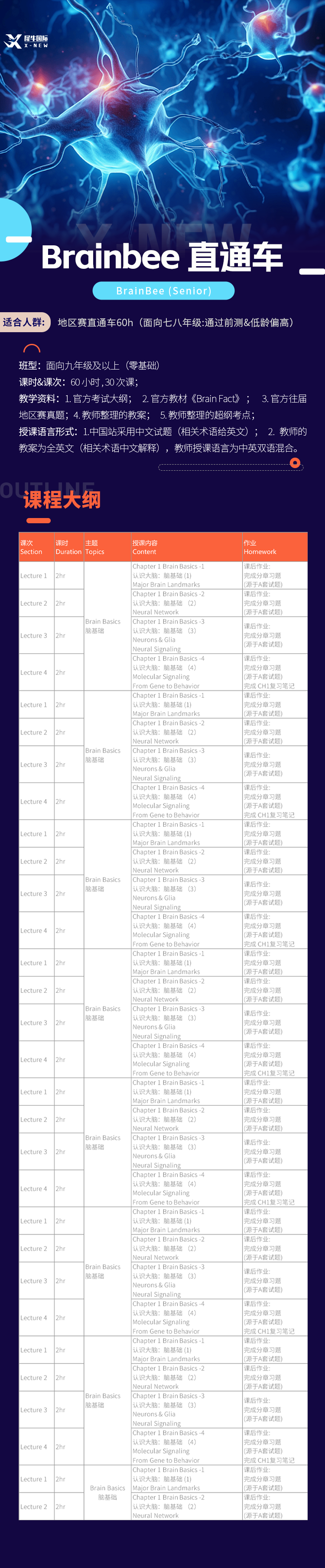 犀牛针对Brain Bee脑科学竞赛开设了不同班型!包括BrainBee junior和Brainbee senior培训课程,适合不同年级、不同基础的学生学习。