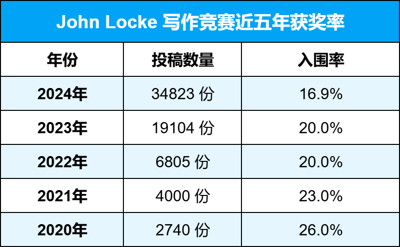 2019年,首届John Locke写作竞赛的参赛人数还不足三千人,五年后参赛人数直接突破三万人,逐渐成为人文社科学子的天花板写作竞赛。