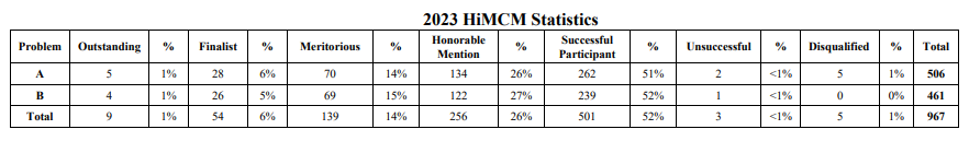 2023年共有967个队伍参赛,涵盖417所学校和18个国家/地区。选择ProblemA的有506支队伍,选择ProblemB的有461支队伍。
