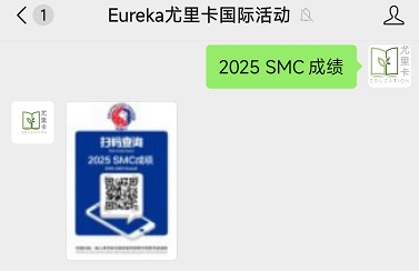 🔍 成绩查询指南 1️⃣ 关注【Eureka尤里卡国际活动】公众号 2️⃣ 后台回复关键词 "2025 SMC成绩" 3️⃣ 扫描自动推送的二维码 4️⃣ 输入 报考年级 + 准考证号(Index number) ❗ 重要提示:同名同校可能存在,请以准考证号为准!