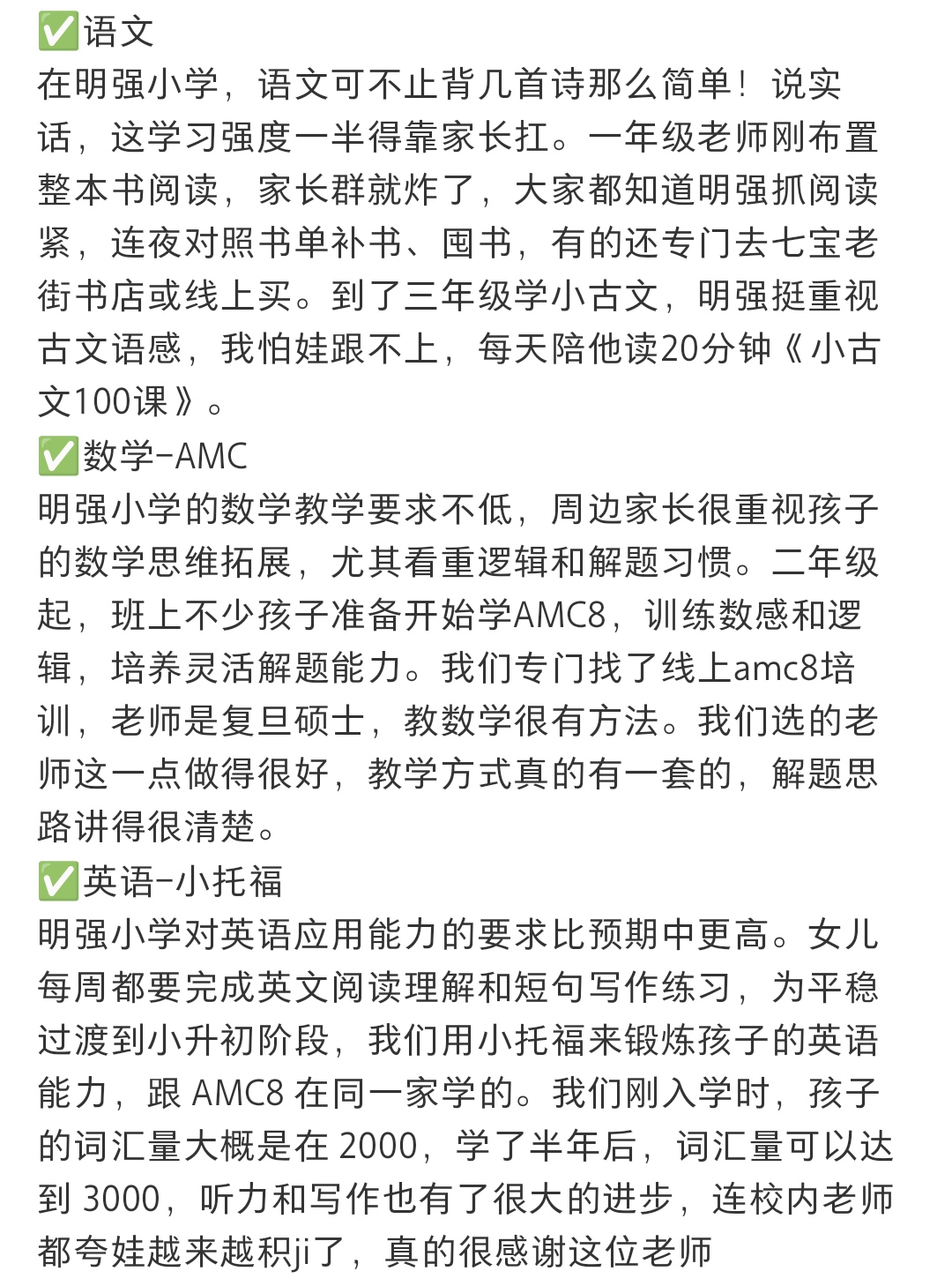 明强小学注重学科基础与思维培养,部分家长可能为孩子补习数学拓展课程,如数学思维训练(袋鼠、AMC8)等,以提升逻辑推理和解决问题的能力,为高年级学习及竞赛做准备。