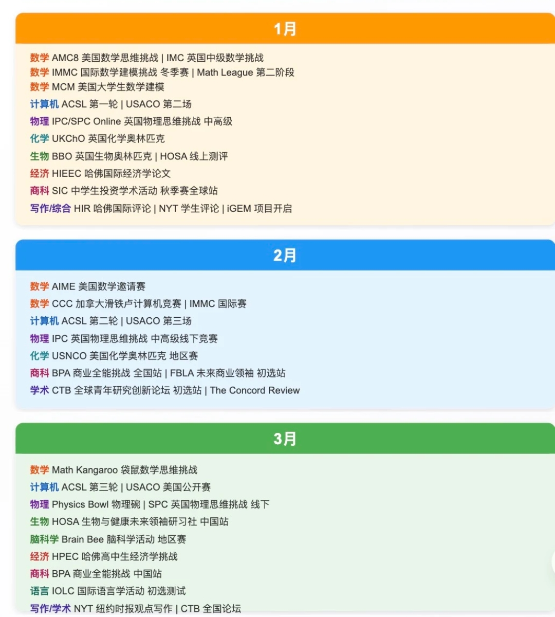 备战国际竞赛,赢在规划起点!我们为你系统梳理2026年全年高含金量理科赛事——从数学、物理、化学、生物到计算机、科创、经济,按月分科清晰呈现关键节点与备赛节奏。这份保姆级时间表,助力理科学子提前锁定赛程、有序备赛,高效布局一整年的进阶之路。收藏转发,一起向奖项冲刺!