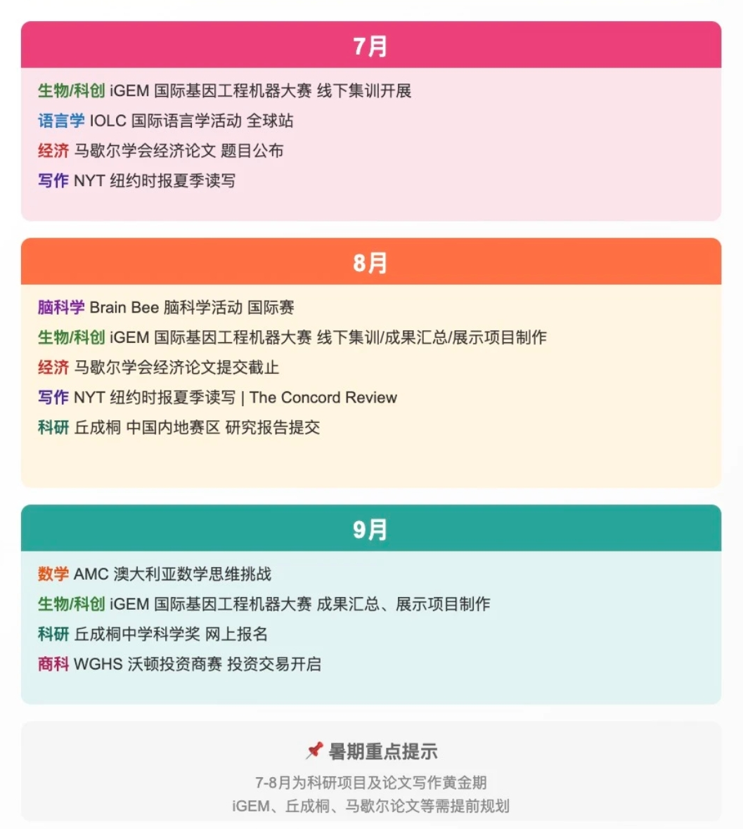 ⏳ 从容管理时间与节奏提早布局可科学分配学习、备赛与考试时间,减少冲刺阶段的压力,尤其能为需要长期投入的科研、论文类项目留出足够周期。