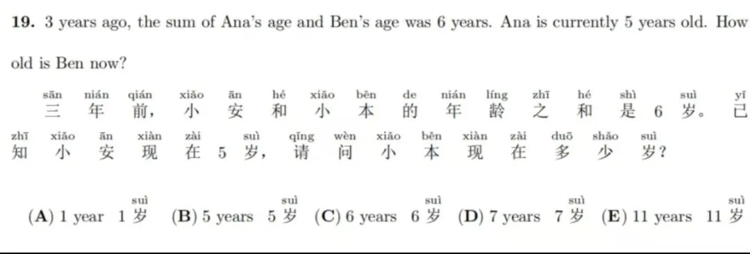 题目分析:这是来自2025年LevelA的题目,核心考察的是年龄问题,属于应用题板块,应用题要读明白题目,分析题目的已知条件,贴近生活,国外竞赛比较注重应用能力,注重应用题的学习