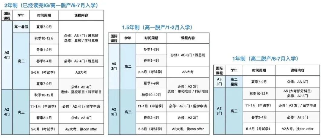 一年脱产ALevel课程的学习模式对大部分同学来说还是比较困难的,所以如果来不及转轨国际高中,可以直接在G11选择脱产ALevel课程,时间线规划和转轨国际高中差不多。