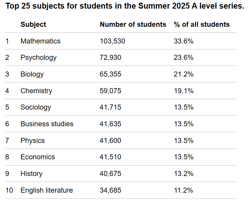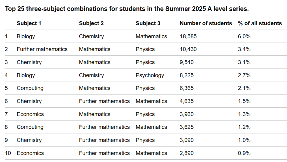 2025年夏季A-Level报考数据显示,以下科目组合最受学生青睐: