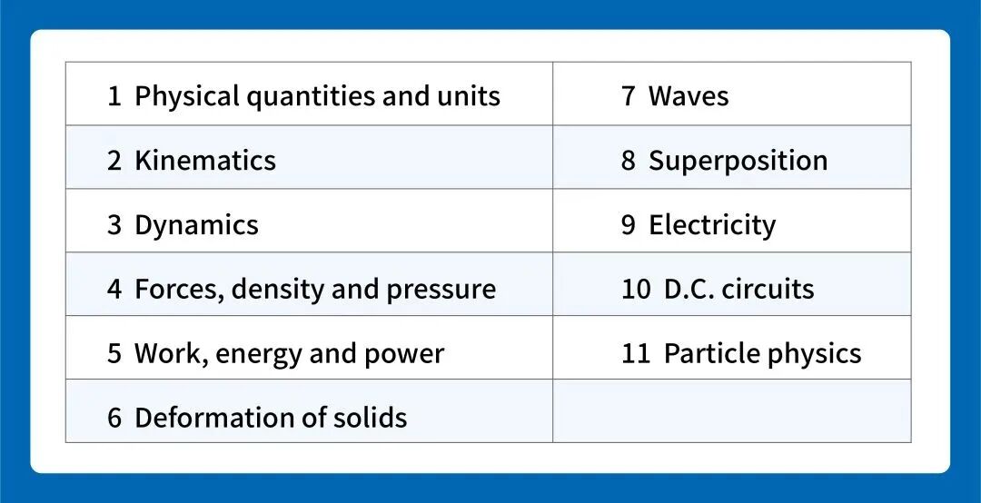 考纲中大部分章节之间的联系还是比较紧密的,所以还可以将这11章节分成以下4大块,分别是普通物理(章节1-6)、波(章节7-8)、电(章节9-10)和原子物理(章节11)。