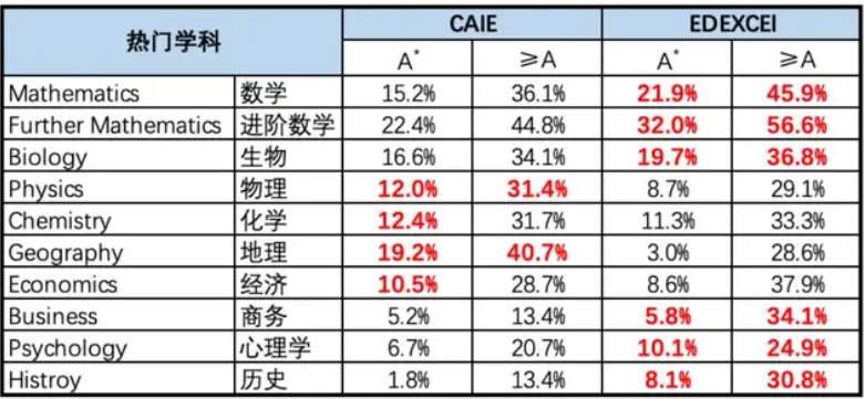 (以上是在不同的考试局,Alevel最热门的科目得A*和A情况)