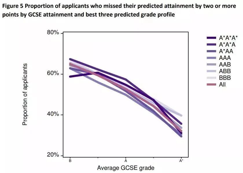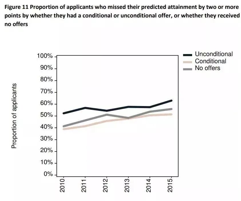 此外,相对较高比例的学生获得了无条件录取通知,但未达到预估成绩;而相对较低比例的学生获得了有条件录取通知,但未达到预估成绩。