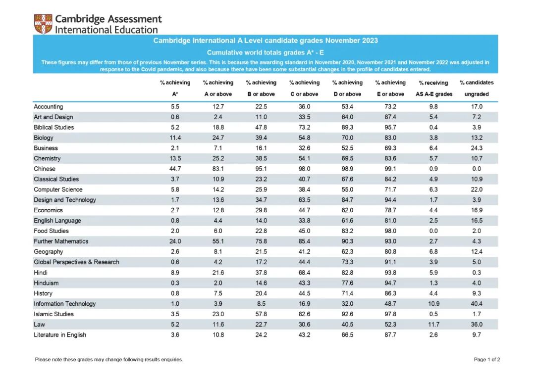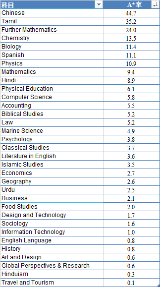 33个A-Level考试科目中,A*率最高的是中文(44.7%),拔得头筹。