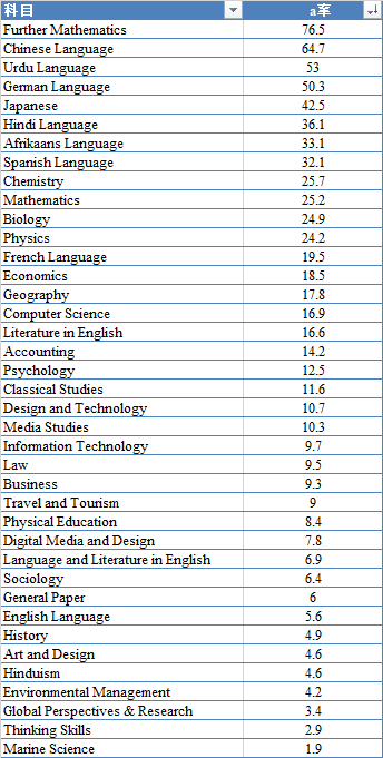 AS level39个考试科目中,进阶数学的a率达到了76.5%,是最高的科目。
