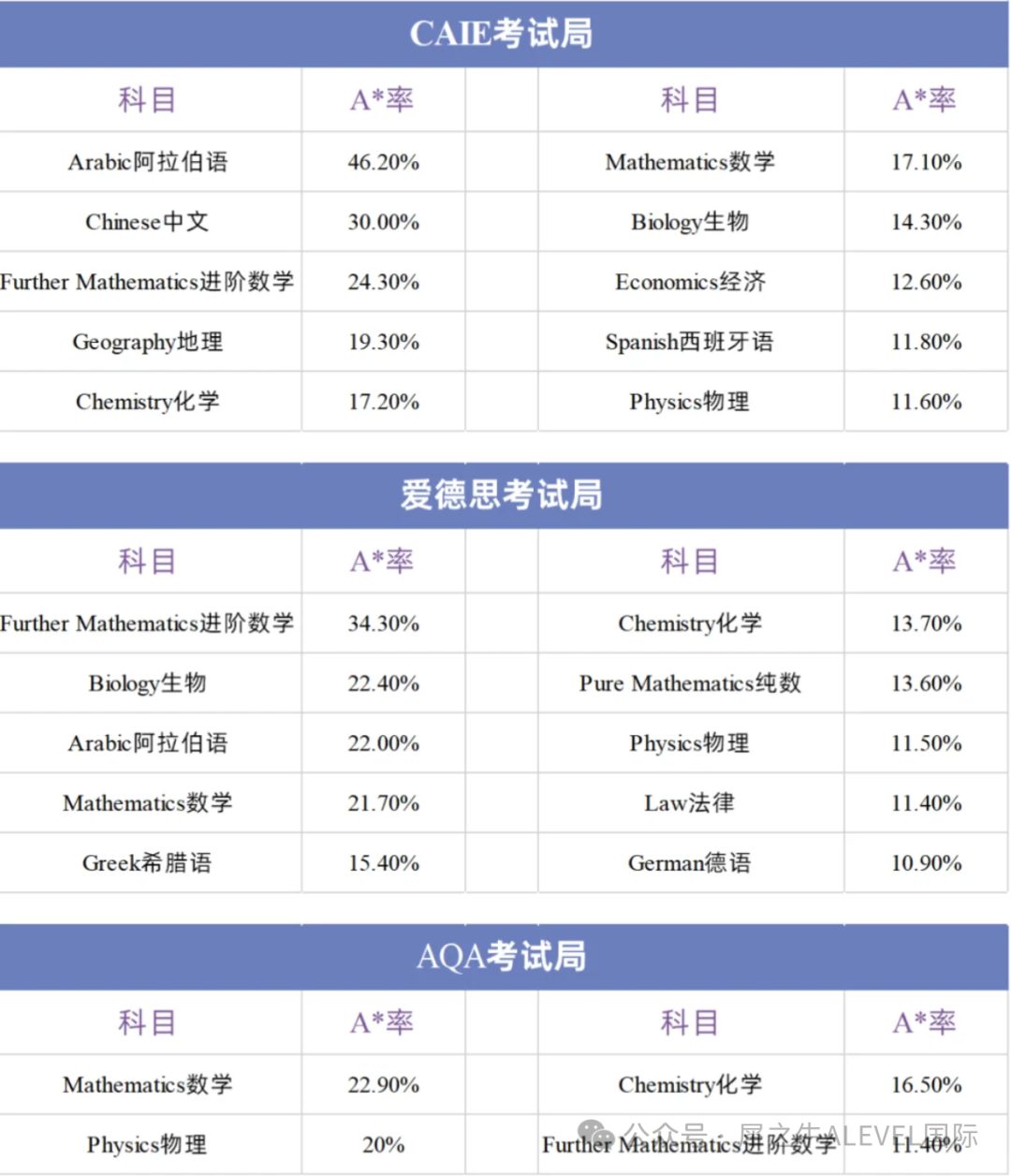 🔸CAIE考试局A*率高的科目 阿拉伯语(46.2%)、中文(30.0%)、进阶数学(24.3%)、地理(19.3%)