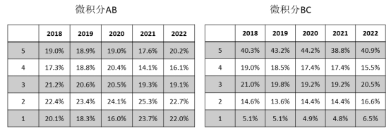 AP微积分BC课程虽从内容范围上较AB课程多,但5分率并不低,甚至是AB科目的2倍。