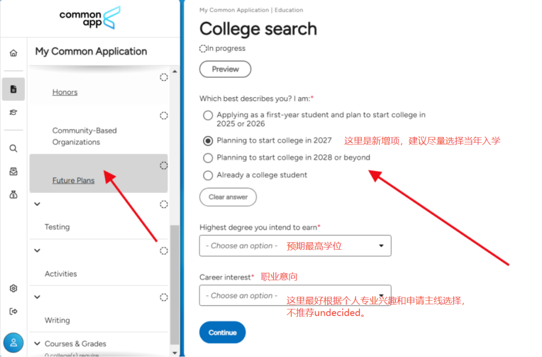 ▶ 未来规划:整个申请系统的个人信息要体现出前后一致。这里的职业意向要和专业兴趣呼应,以及个人学术探索背景相关。