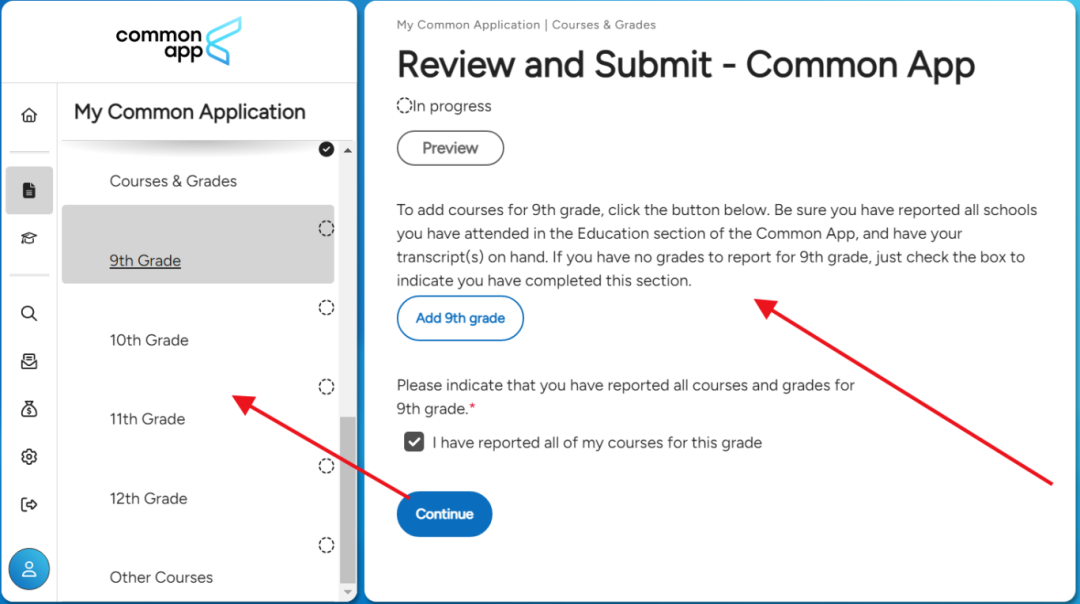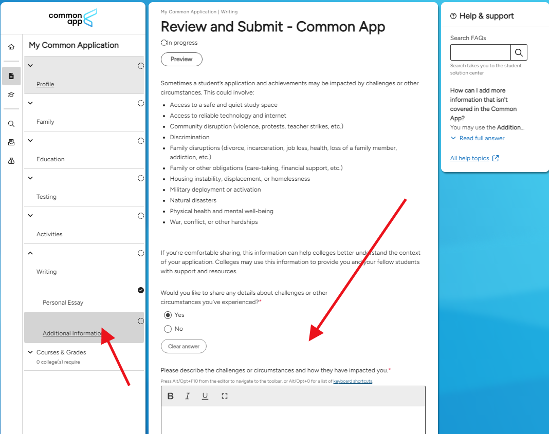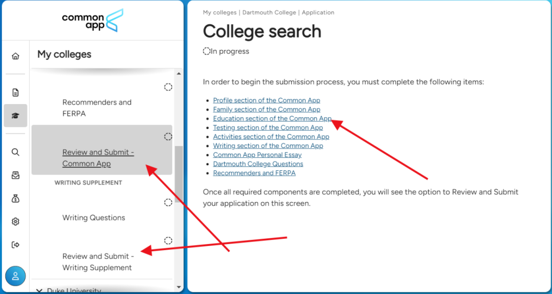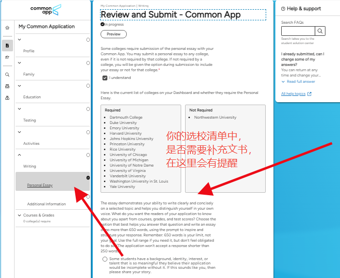 在完成Common App的所有部分以及指定大学的Recommenders and FERPA、Writing Supplement等内容后,同学们可以点击“Review and Submit”部分,进入预览界面。