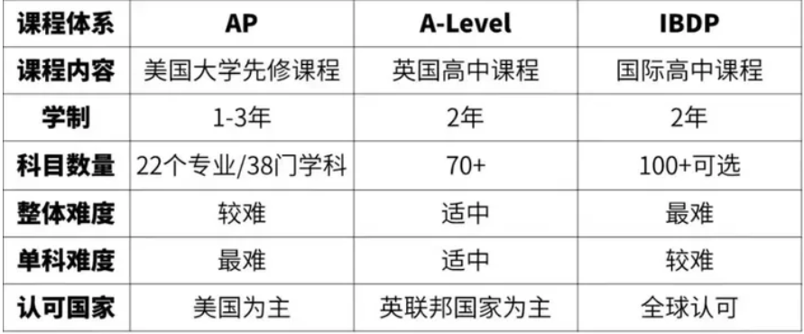 其实和传闻的一样,三大体系中IB课程是最难的,但是适用范围是最广的,Alevel课程针对的是英联邦国际开设的科目也比较多,学生可以选择自己擅长的科目进行学习。AP课程则和IB已经Alevel课程不同,AP是美国大学的先修课程。